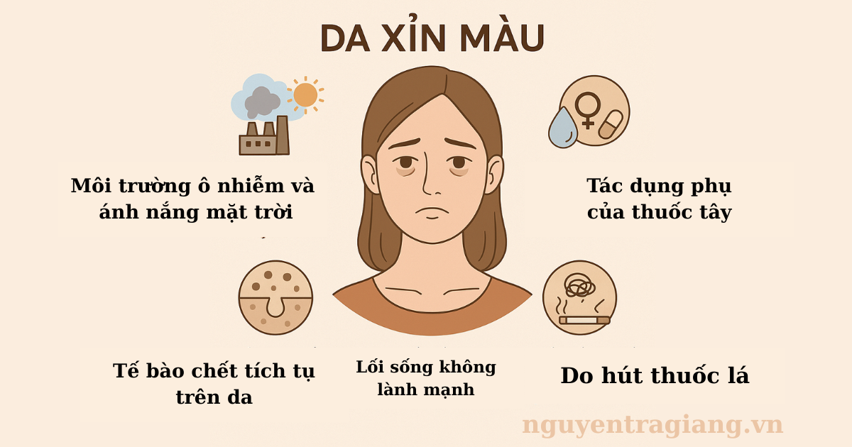 • Ô nhiễm môi trường: Khói bụi và tia UV phá hủy cấu trúc da, làm da tối màu.